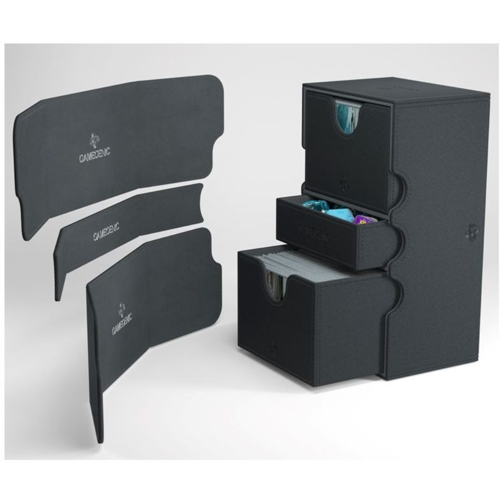 Two removable card holders keep up to 200 double-sleeved cards in this large and extremely robust deck box. The Stronghold is covered with elegant Nexofyber material, with soft microfiber inside, and also contains an accessories drawer. Just like other Convertible products, its flaps are removable and can be clipped to the back side of the box. Powerful magnets ensure a safe closure. Completely removable, interchangeable flaps and inner card holders offer Mix & Match customization options.