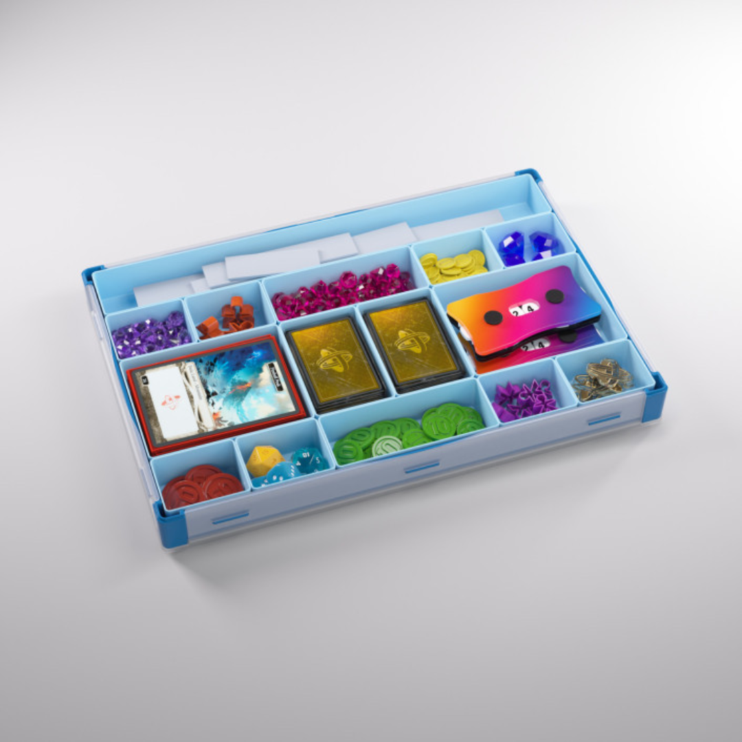 There are 15 trays in 5 different sizes, including 2 Mini-American trays, 2 Standard Card trays, as well as 1 extra-long tray. All trays are fully removable and can be swapped with trays from the original Gamegenic Token Silo and Token Silo Cards Add-on, granting maximum flexibility and additional customization. The cover of the Token Silo XL clips to the bottom for easy access and more space on the gaming table. It is made of durable material, easily stackable, and available in 8 different colours.