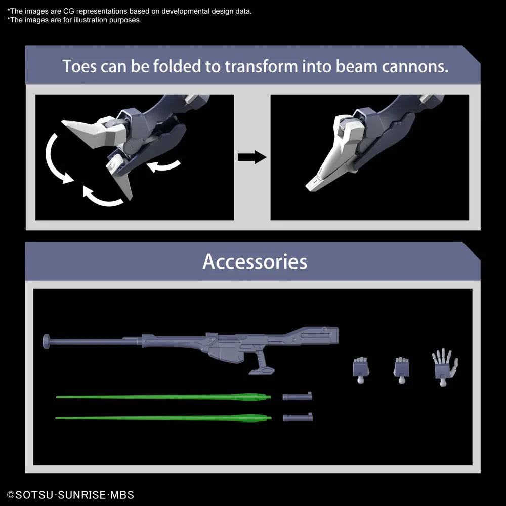 The built-in back booster will protrude if you push on the tip of the shoulder armor. The beam saber's grip can be stored in the arm armor, too. The shell unit's brilliance is expressed with clear parts, colored molding, and stickers; the Gundam's toes can fold down as well. The Pharact's massive rifle and a pair of beam sabers are also included, as are interchangeable hands.